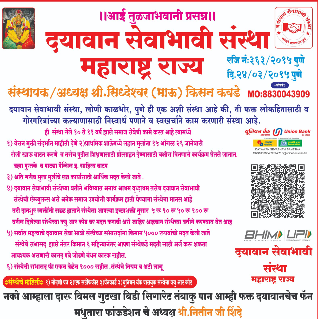 महाराष्ट्र राज्यभर सामाजिक, शैक्षणिक व मानवतावादी कार्यात सक्रिय असलेल्या दयावान सेवाभावी संस्था, महाराष्ट्र राज्य यांच्या वतीने समाजातील गरजू घटकांसाठी मदतीचे आवाहन करण्यात आले आहे. आर्थिक अडचणी, आरोग्य समस्या, शिक्षणासाठी मदत तसेच आपत्कालीन परिस्थितीत गरजूंना आधार देण्याचे कार्य ही संस्था सातत्याने करत आहे. कोणालाही मदत करण्याची इच्छा असल्यास त्यांनी स्वेच्छेने संस्थेच्या अधिकृत स्कॅनरद्वारे किंवा थेट संस्थेला भेट देऊन सहकार्य करावे, असे आवाहन संस्थेच्या वतीने करण्यात आले आहे.